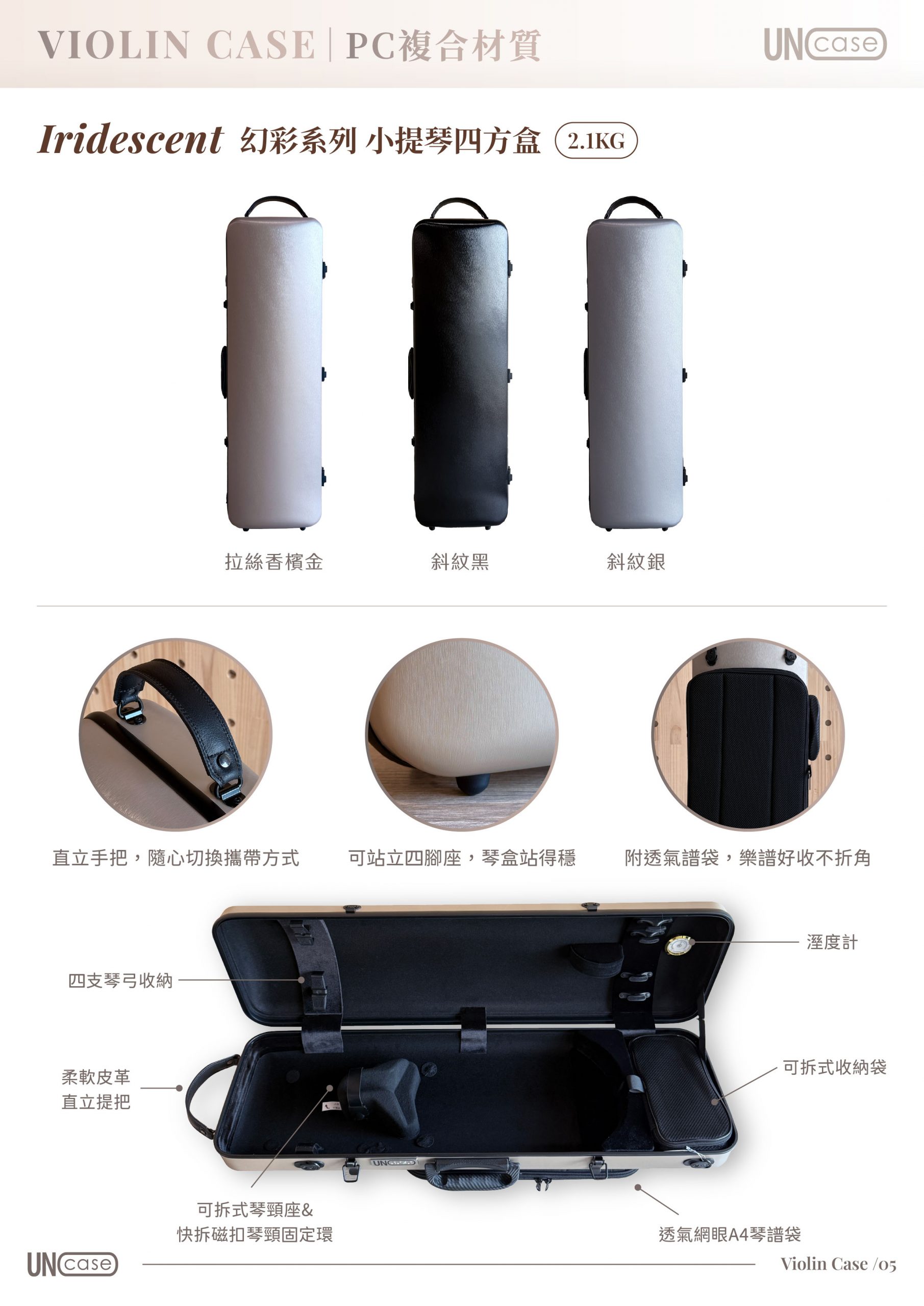 ★PC複合纖維材質一體成型製成,兼具輕量化及堅固抗壓特性,耐熱、耐用、防刮。 ★可拆式琴頸固定環設計以單手快拆磁扣,並可調整固定環的鬆緊度,使提琴更服貼內襯不易晃動。 ★可手提雙肩背,背帶加厚減壓設計,減輕雙肩負擔。 ★膠條密封性佳,防止水滴滲入盒內。 ★內附濕度錶,隨時監控樂器的狀況。 ★重量:2.1kg。 ★尺寸:4/4。